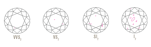 Diamonds are formed deep within the earth, then put under intense heat and pressure. As a result, the diamonds form imperfections called inclusions (inside of the diamond) and blemishes (exterior of the diamond). So when we talk about the clarity, we’re talking about the absence of these birthmarks. There are 11 grades. Most reputable jewellers will not carry anything below SI2. It’s important to keep in mind what the naked eye can or cannot see when dealing with clarity. For example, just because Flawless is the best grade, other grades may be just fine because the human eye will not be able to tell the difference.